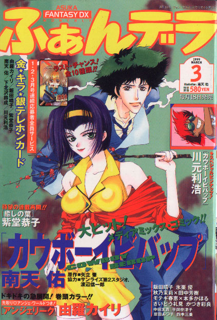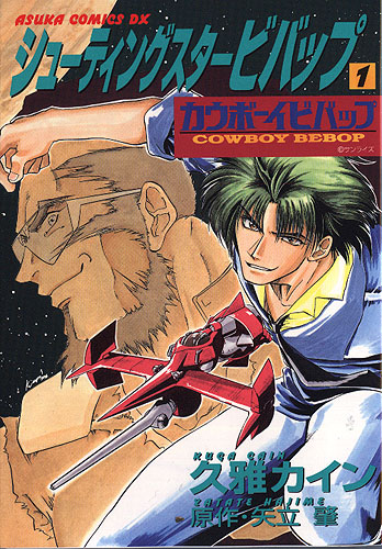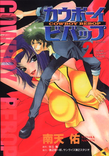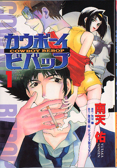 Written By: Hajime Yadate Art By: Nanten Yutaka The Cowboy Bebop Manga version ran in the Monthly manga collection called Asuka Fantasy DX. Like the TV series, the Manga appears to be episodic in nature, each volume of DX containing a separate adventure. I should also point out that "Hajime Yadate (or Yatate)" is a pen name for a group of writers at Sunrise. There are 3 collected volumes (tankoubon) for Cowboy Bebop so far. The first came out on April 7th 1999, for 520 yen. The ISBN# is: 4-04-853078-X Volume 2 came out in November of 1999. Its ISBN# is: 4-04-853136-0 and it has a cover price of 520 yen. Volume 3 came out in April of 2000. Its ISBN# is: 4-04-853185-9 and it has a cover price of 520 yen. Below are scans of the tankoubon covers. TOKYOPOP has translated the Bebop Manga drawn by Nanten Yutaka into English and released it in the US. How Amazing, I never would have expected that. I can't comment on how good the translations are, but if yu need another Bebop fix, this might be the thing for you. It's out of print now, but copies show up on Amazon sometimes!